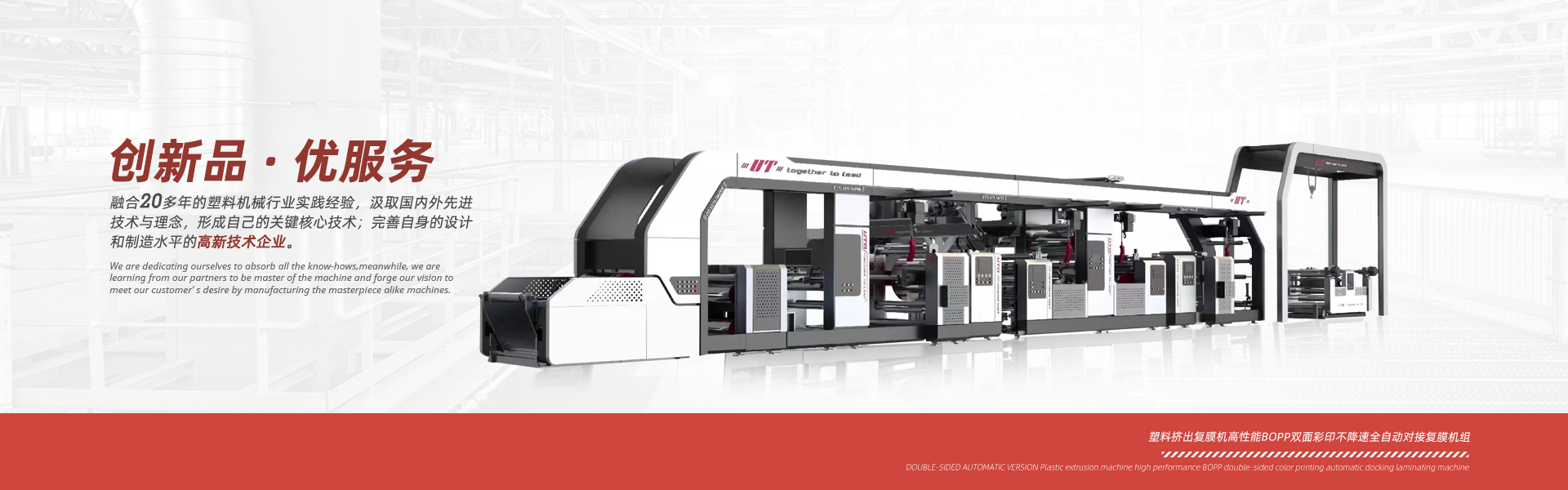 優(yōu)特機(jī)械精心致力于塑料編織行業(yè)、紙塑軟包裝行業(yè)、輪胎制造行業(yè)等成套生產(chǎn)設(shè)備的設(shè)計和制造,并為用戶提供生產(chǎn)工藝及培訓(xùn)。我們的服務(wù)范圍包括各類塑料覆膜機(jī)、紙張覆膜機(jī)、BOPP彩印膜雙面自動對版覆膜機(jī)、 紙塑邊縫三合一覆膜機(jī)、中縫印刷制袋機(jī)、以及輪胎行業(yè)循環(huán)回收使用的隔離膜生產(chǎn)線。